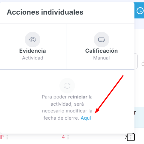 Cabe aclarar que para realizar está acción es importante que la actividad esté vigente, es decir, que aun esté en tiempo para ser presentada. En caso de que la actividad haya vencido, se recomienda editar la Fecha de cierre, para que de esta manera esté habilitada la acción individual Reiniciar.